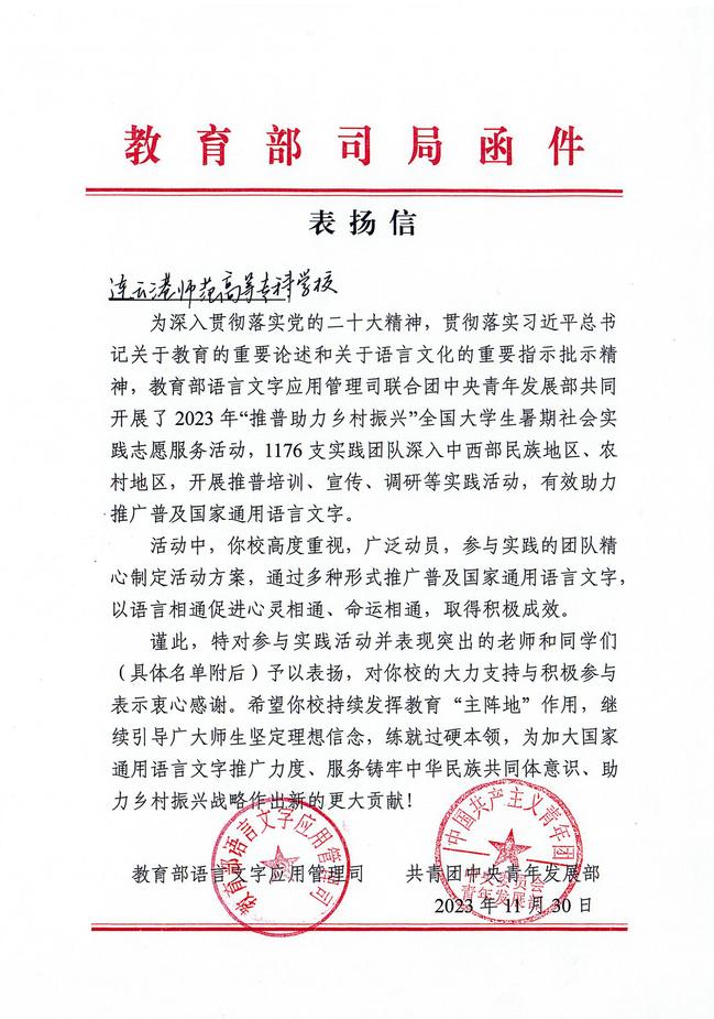 教育部语言文字应用管理司和共青团中央青年发展部来信表扬,充分肯定了我校在“推普助力乡村振兴”志愿服务活动中的突出表现。学校将继续深入贯彻落实习近平总书记关于教育的重要论述和关于语言文字工作的重要指示批示精神,响应国家号召,发挥教育“主阵地”作用,继续引导广大师生坚定理想信念,积极探索推普助力乡村振兴新路径,为加大国家通用语言文字推广力度、服务铸牢中华民族共同体意识、助力乡村振兴战略作出新的更大贡献。
