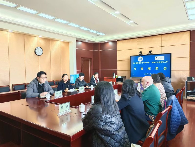,我校对Javier Díaz一行来访表示热烈的欢迎,向Javier Díaz及随行人员介绍了学校百年办学历史、事业发展情况及近年来学校在国际合作交流方面取得的进展与成果,并表示希望通过本次代表团来访,两校间能够深化友谊,充分发挥各自特色优势,找到可以合作的领域,为两校师生开阔国际视野、促进专业提升、丰富人文交流搭建优质平台,促进两校共同发展。