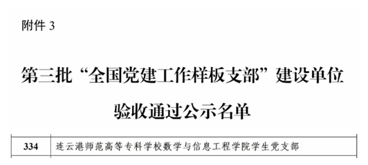 近日,教育部思想政治工作司发布了《关于第三批新时代高校党建示范创建和质量创优工作和第二批高校“双带头人”教师党支部书记工作室建设单位验收结果的公示》,我校数学与信息工程学院学生党支部顺利通过第三批“全国党建工作样板支部”建设单位验收。