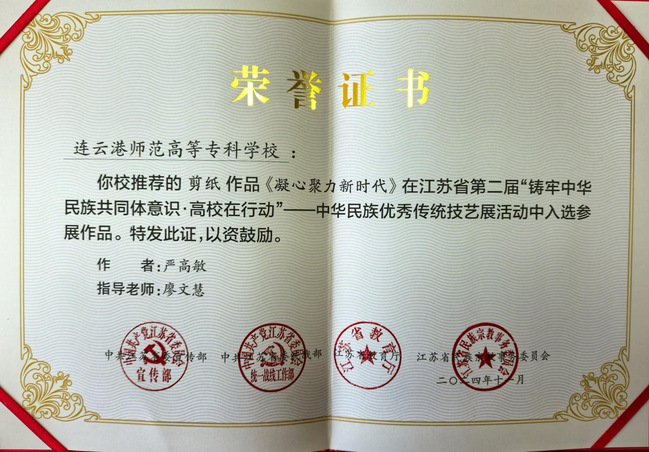 近日,由江苏省民宗委、省委宣传部、省委统战部、省教育厅主办,苏州大学承办的江苏省第二届“铸牢中华民族共同体意识·高校在行动”铸牢中华民族共同体意识知识竞赛决赛暨总结大会落下帷幕。我校美术学院廖文慧老师指导,22环境艺术设计班严高敏同学创作的剪纸作品《凝心聚力新时代》入选江苏省第二届“铸牢中华民族共同体意识·高校在行动”——中华民族优秀传统技艺展活动参展作品。