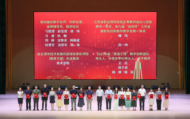 会上,校领导分别为江苏省教学名师获得者、连云港市劳动模范获得者、从教30年教师、省青蓝工程教学创新团队、中青年学科带头人和骨干教师、省技能大赛教师组一等奖获得者、省新教师教学竞赛一等奖获得者以及校第四届教学名师、科研名家、金牌辅导员和服务标兵等颁奖。